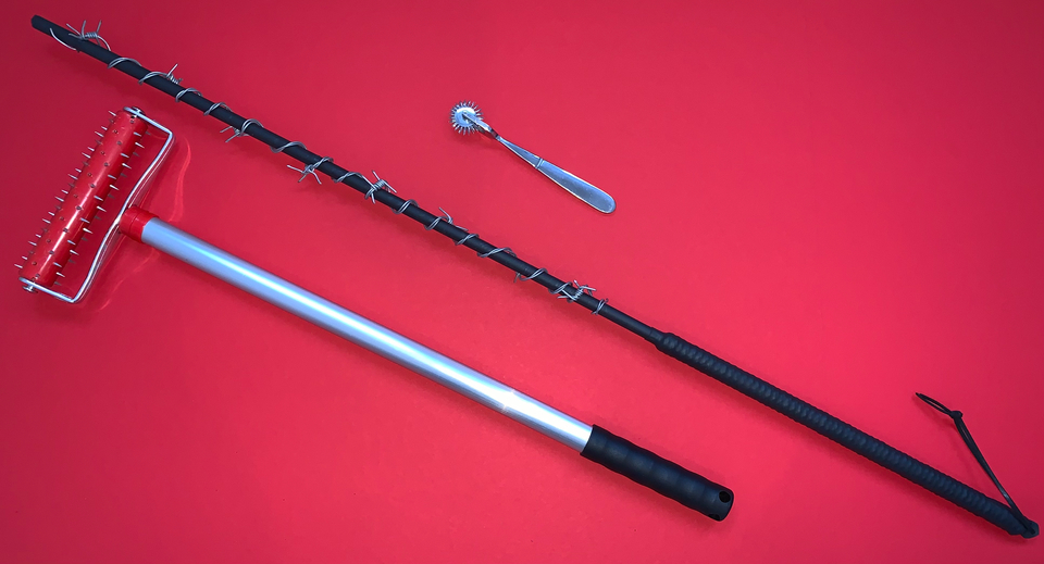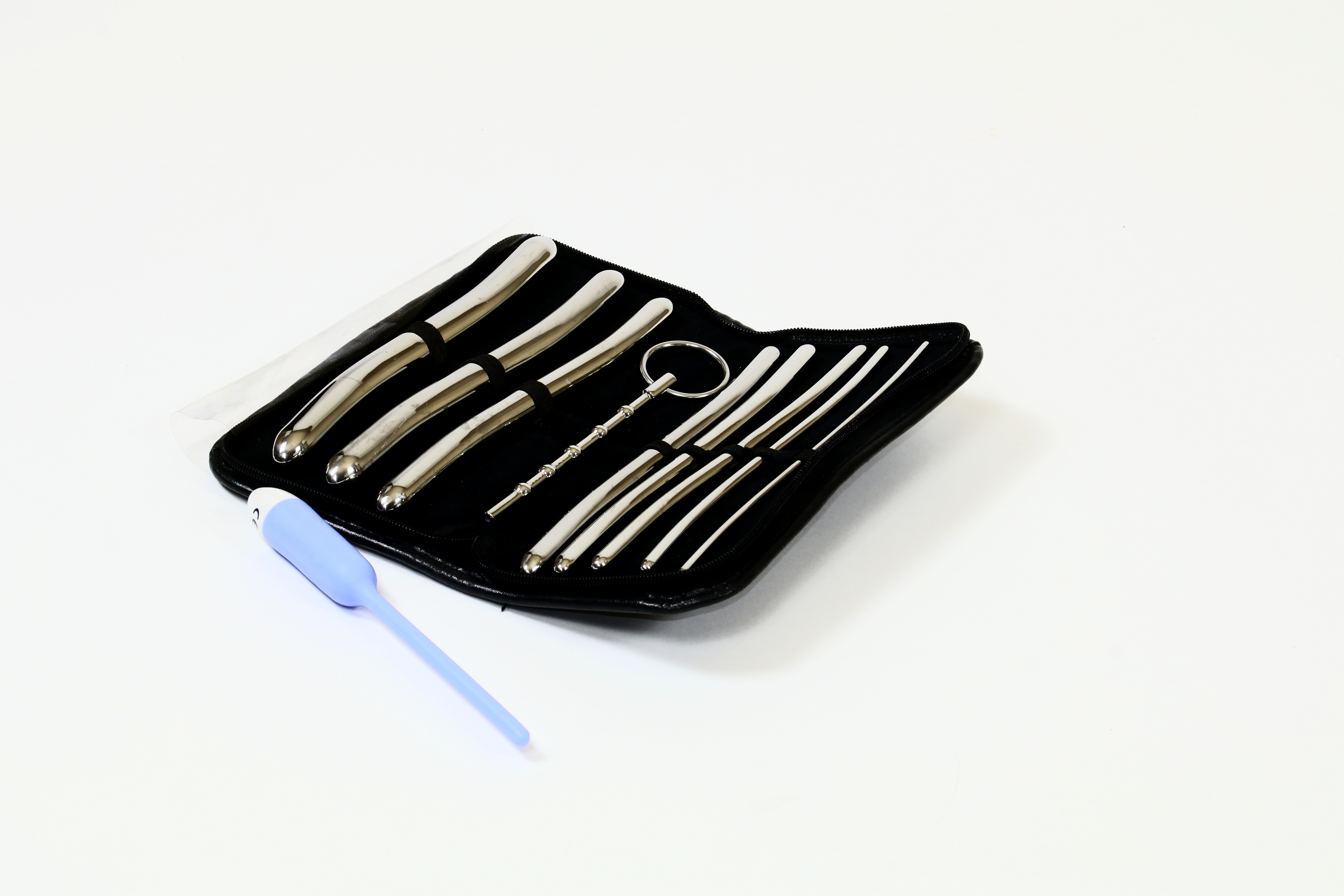 Harnröhrendehnstäbe aus Edelstahl ( auch Dilatoren, Dilatatoren oder Bougie genannt ) in den Größen von mindestens 3mm bis maximal 18mm, sowie einem Harnröhrenplug in der Größe von 5mm mit fünf Stimulationskugeln in der Größe von 7mm und zusätzlichem Loch zum abspritzen und auch einem Harnröhrenvibrator aus weichem Silikon in der Größe von 7mm. ( alle genannten mm-Angaben sind der jeweilige Durchmesser )
